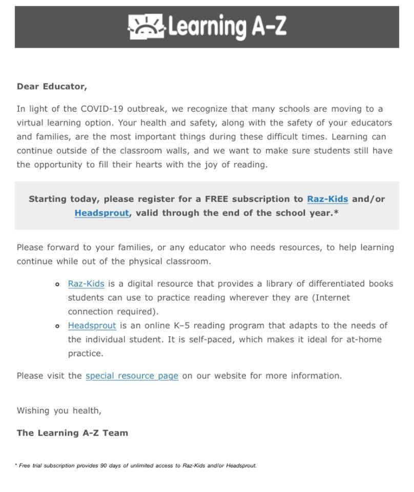 ABC mouse is offering free membership now also. Code : SCHOOL7771